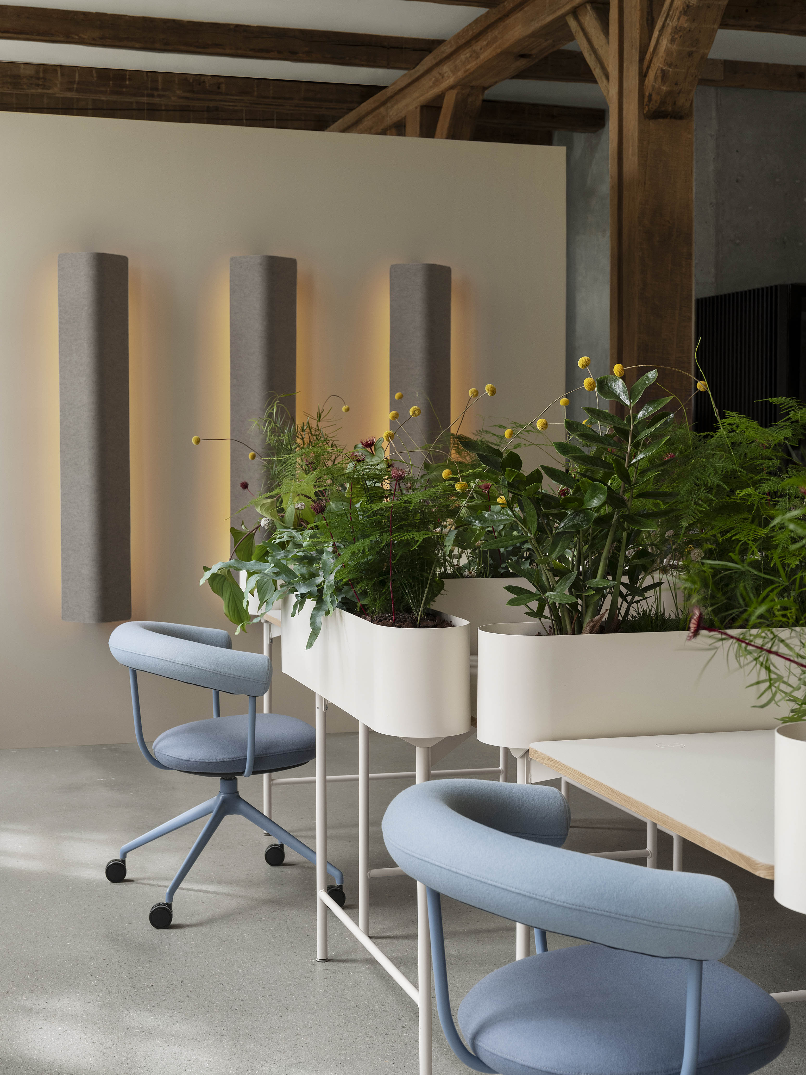 Shaped as triangles and rectangles, these work desks can be tailored to create unique combinations that suit each project’s specific requirements. Framed by planters, they provide a pleasant and natural setting, making each workspace not only functional but also inviting and refreshing.