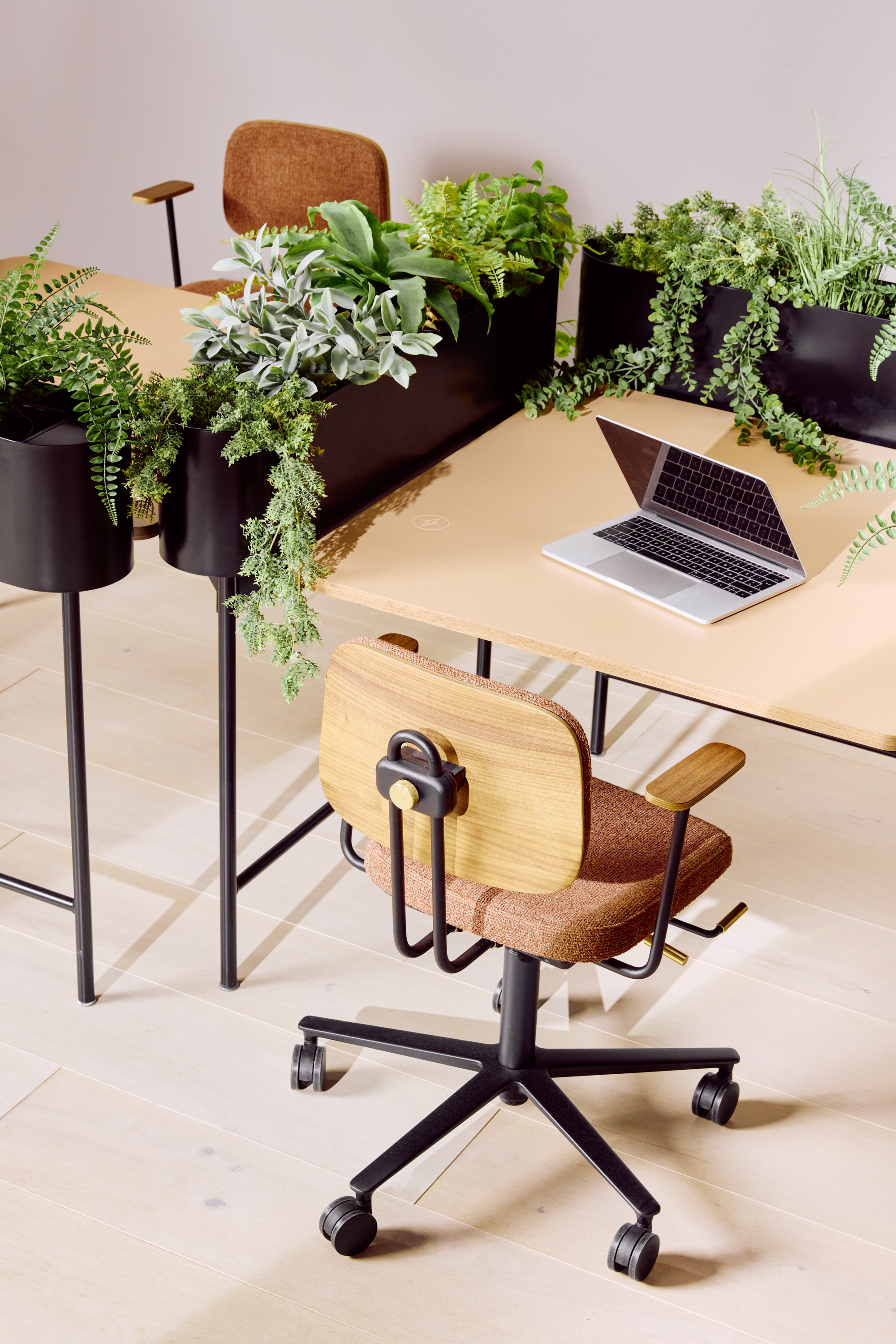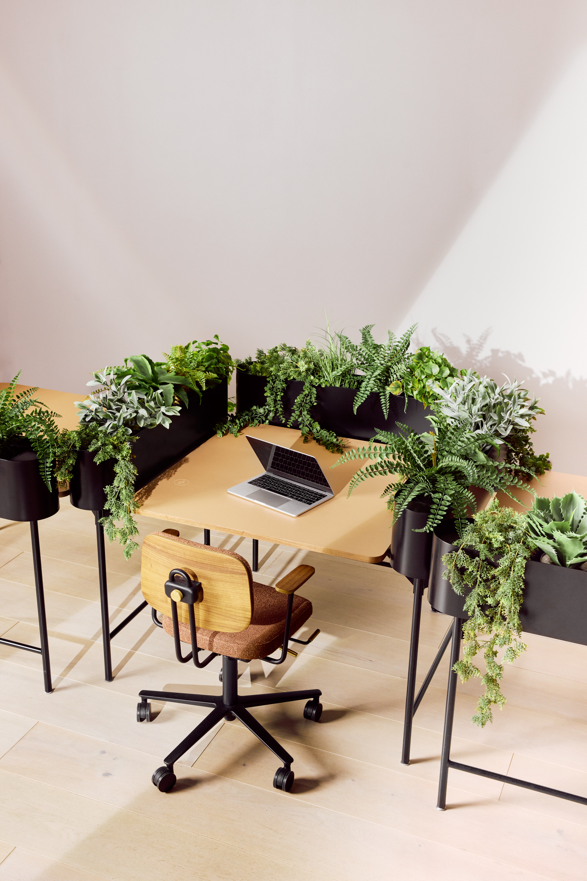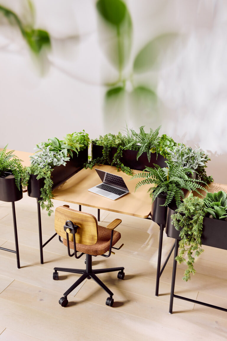 functional, adaptable desks that come in triangle and rectangle shapes for endless combinations. Framed by planters, they provide an inviting,